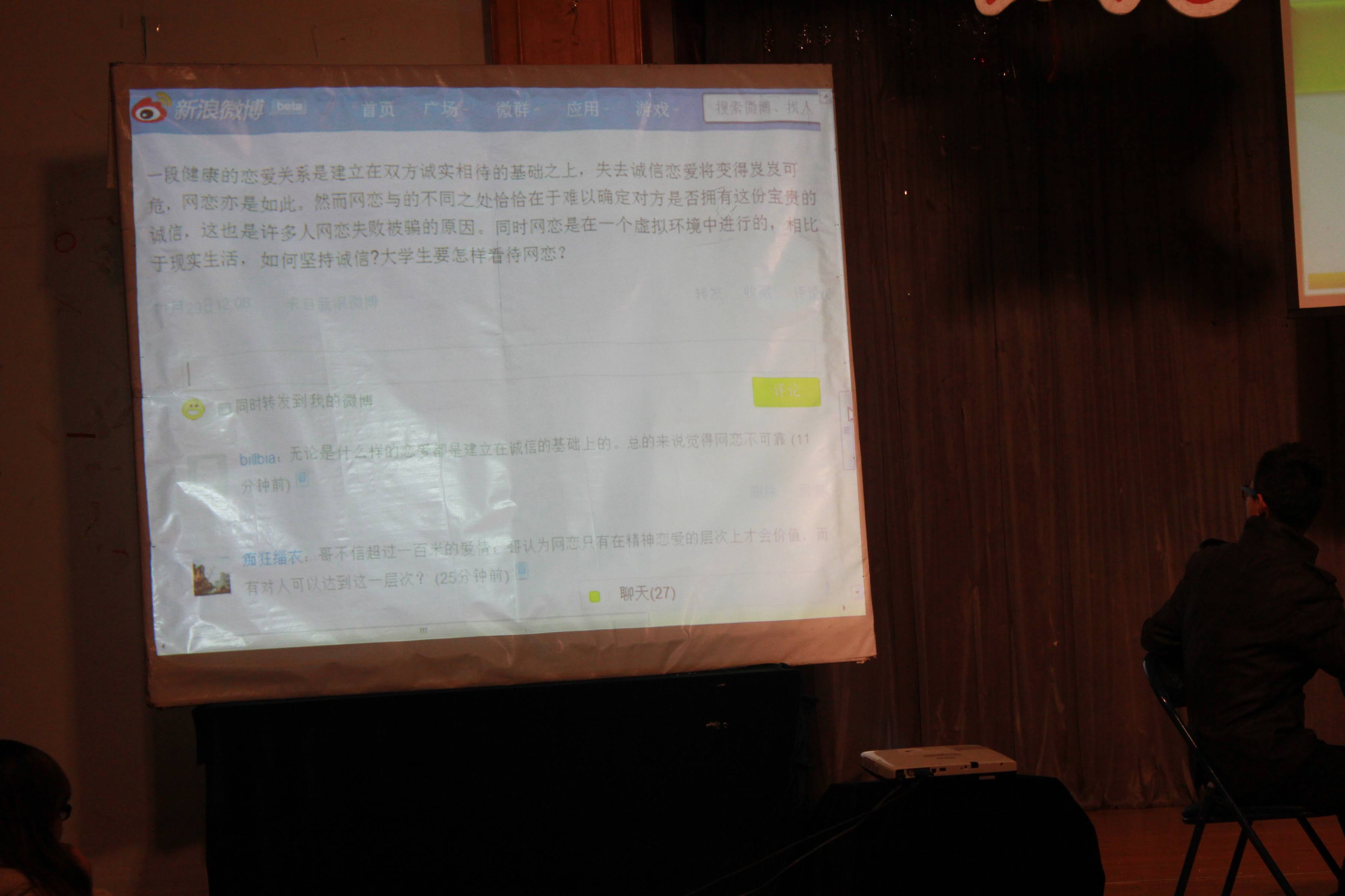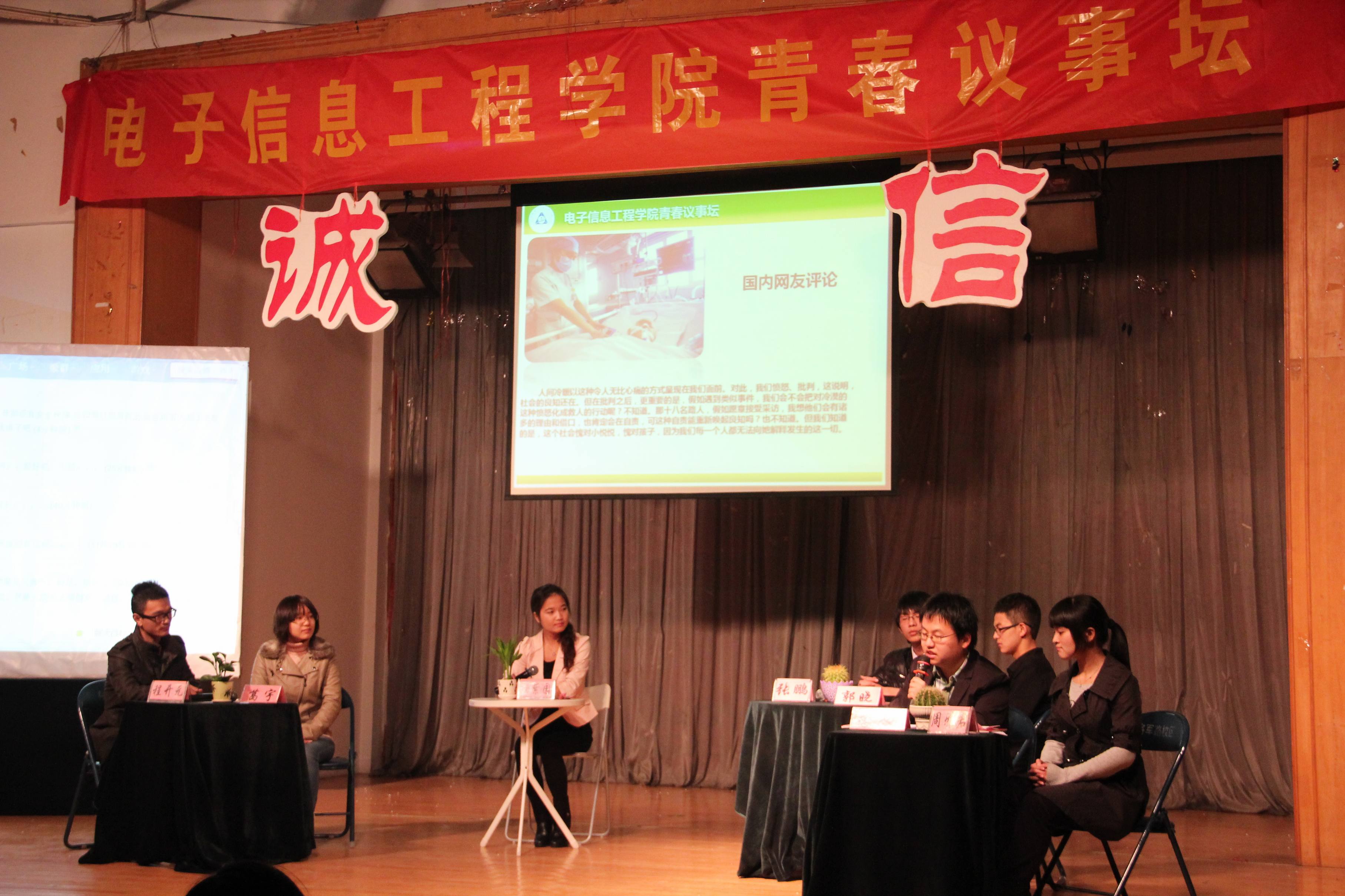 本期议事坛以"我与诚信,谁弃谁?"为主题,旨在通过对近期热点问题进行多角度讨论,进一步增强在校大学生的诚信意识。活动分为网络诚信、社会诚信和校园诚信三个讨论模块。台上六位同学分别针对"金庸被死亡"、"地震谣传"、"小悦悦事件"以及"抄作业现象"、"学术诚信"等话题展开了热烈讨论,台下同学通过微博、举牌等形式参与讨论。活动过程中,在场嘉宾对同学们的发言进行了现场点评。
