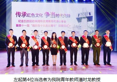 2015年5月4日,团南京市委举办了“第十一届南京市十大杰出青年颁奖仪式”。我院青年教师潘时龙教授获此殊荣,可喜可贺!希望我院全体青年以潘老师为榜样,“勤学、修德、明辨、笃实”,用勤劳的双手和智慧的头脑,在平凡的学习、工作、生活中创造出不平凡的成绩!