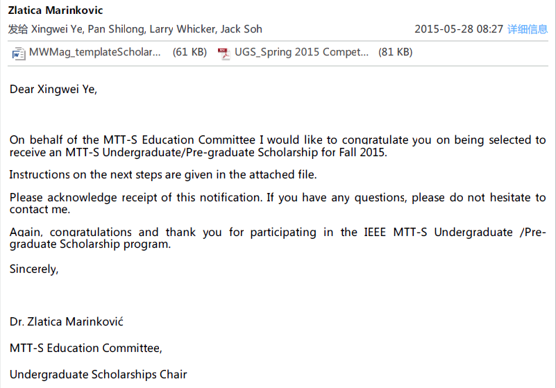 IEEE MTT-S本科生/研究生奖学金是根据申请人参与项目的学术水平、研究团队的实力以及申请人的经历等评定的。IEEE MTT-S是射频、微波、毫米波理论和应用领域最具权威的组织之一,其出版物“IEEE Transactions on Microwave Theory and Techniques”是国际微波领域的顶级期刊。其专为本科生/研究生设立的MTT-S奖学金,颁发给全球的优秀大学生,鼓励他们从事微波技术方面的研究。每年IEEE MTT-S 从全球范围内的申请人中筛选出约10名奖学金获得者。除了颁发获奖证书外,还提供1500美元奖金和1000美元参加颁奖会的旅行补助。自该奖项于2001年设立以来,中国大陆只有13位学生获得了该奖学金。这是该实验室近三年来第四次捧得该奖项。