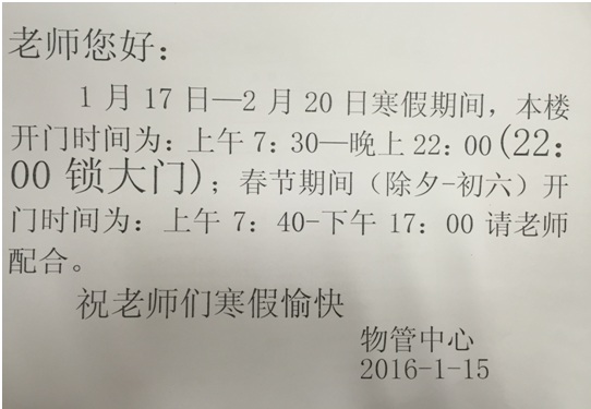 2) 教工:因工程教育专业认证准备工作需要,原则上,在2016年1月18日至1月28日期间,所有教职员工需留在南京,做到有需要可以及时赶到办公室。其他时间安排由各工作组负责详细布置。寒假开学时间为:2月21日(星期日)正常上班。
