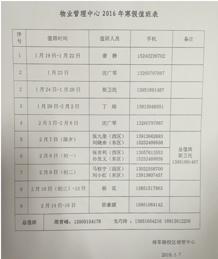 附:寒假期间办公楼、实验楼物管值班安排