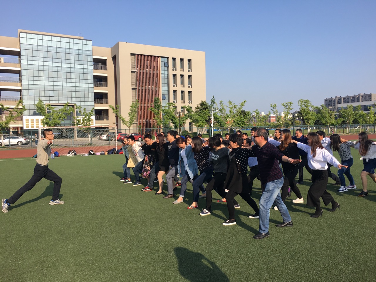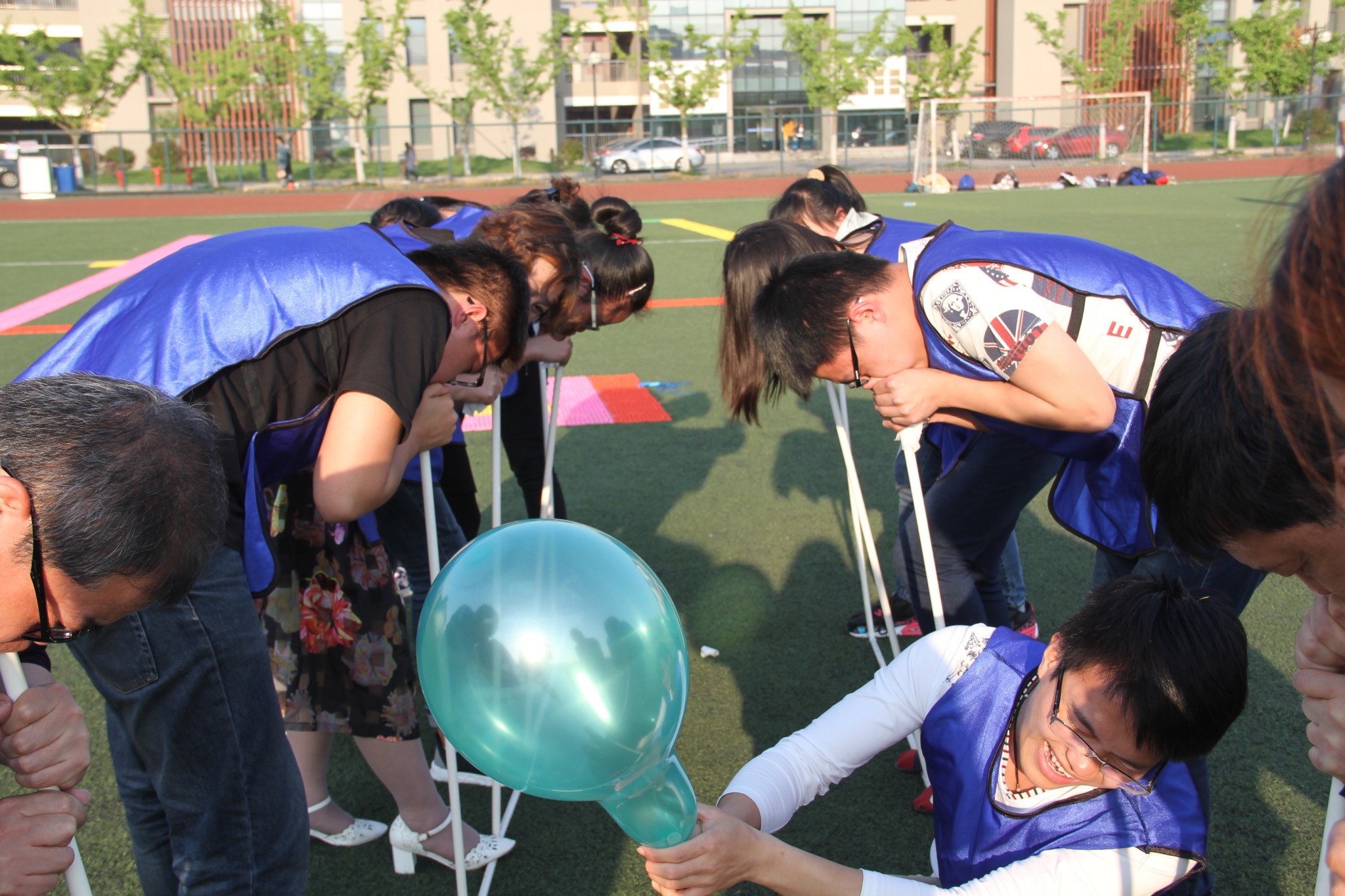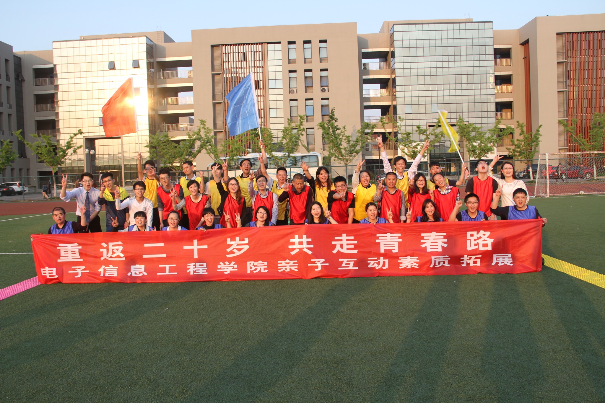 会后,在志愿者的指引下,家长和自己的孩子们一同前往东区操场,参加了“重返二十岁,共走青春路”亲子互动素质拓展。在互动中,爸爸妈妈和孩子相互协作,为了同一个目标努力,运用各自智慧解决过程中的各种难题,队伍与队伍之间的比拼让很多家长和孩子明白了团队合作的重要性,也明白了在通往胜利的道路上除了自信还需要的是坚持不懈的努力和适当的变通技巧。