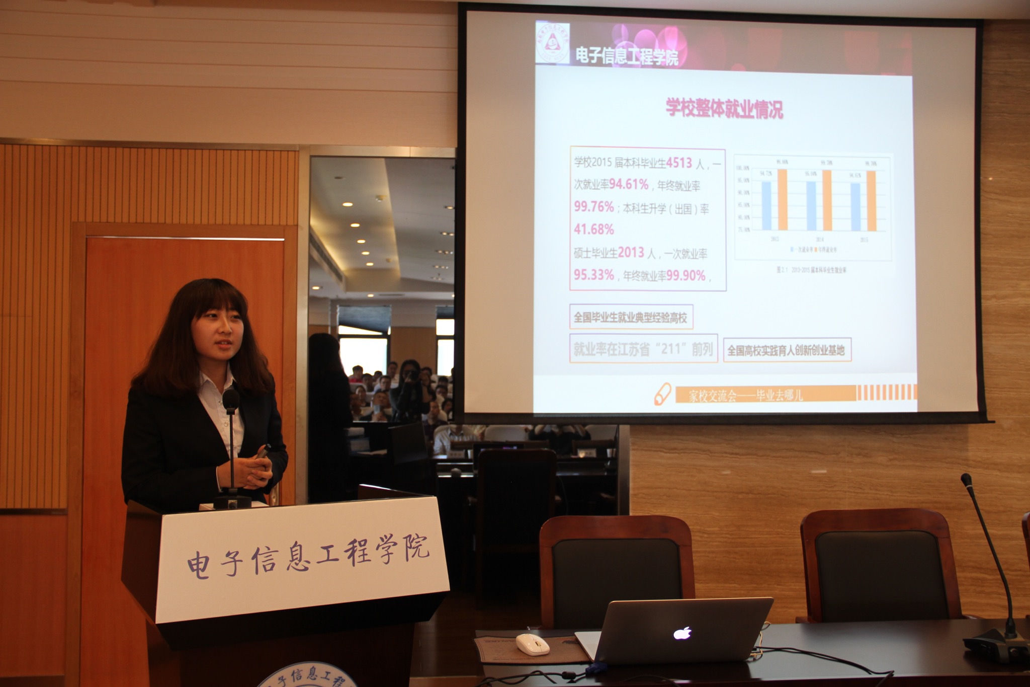 时进行的电子信息大类专业分流会由院副院长张弓主持,在介绍完此次专业分流的基本政策和流程后,电子信息类四大本科专业(方向)的负责老师分别就专业内容,未来发展,学生要求等方面向同学们进行了详细的介绍,并在会后家长以及学生进行答疑解惑。