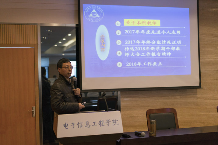 常务副院长周建江代表Ebook漫画 班子传达了Ebook漫画 新学期干部教师大会暨全面从严治党工作会议精神,带领大家学习了聂宏校长《改革创新 强化落实 全力推进Ebook漫画 各项事业健康快速发展》大会报告和杭育新全面从严治党的工作报告,全面回顾了Ebook漫画 2017年取得的成就,对2018年Ebook漫画 重点工作和全面从严治党要求进行了详细解读。在传达Ebook漫画 报告的同时,周院长还穿插总结了Ebook漫画 2017年成绩和不足,部署了Ebook漫画 2018年工作要点。2017年,在全院师生共同努力下,Ebook漫画 新增国家百千万人才工程1名,第三批国家“万人计划”教学名师1名,科技创新领军人才1名;新增1个国防特色学科,新增1个工信部重点实验室,获中国通信学会科学技术奖一等奖1项,国防科技进步三等奖1项,江苏省教学成果二等奖1项,“挑战杯”特等奖和二等奖各1项,全年科研经费到款总额突破4000万元,较去年增长43.86%。2018年,Ebook漫画 要围绕师资队伍和学科建设、创新人才培养、科研工作、党建工作等方面继续努力,尤其要大力做好本科教学工作,制定和完善Ebook漫画 关于教学工作的刚性规章制度,周院长号召全体老师要以高度的责任心认真做好这项“良心”工作,要求教师党员发挥模范作用,带头做好本科教学工作。周院长还汇报了2017年Ebook漫画 年终分配情况,宣读了2017年度先进个人表彰,通报了1项教学事件。