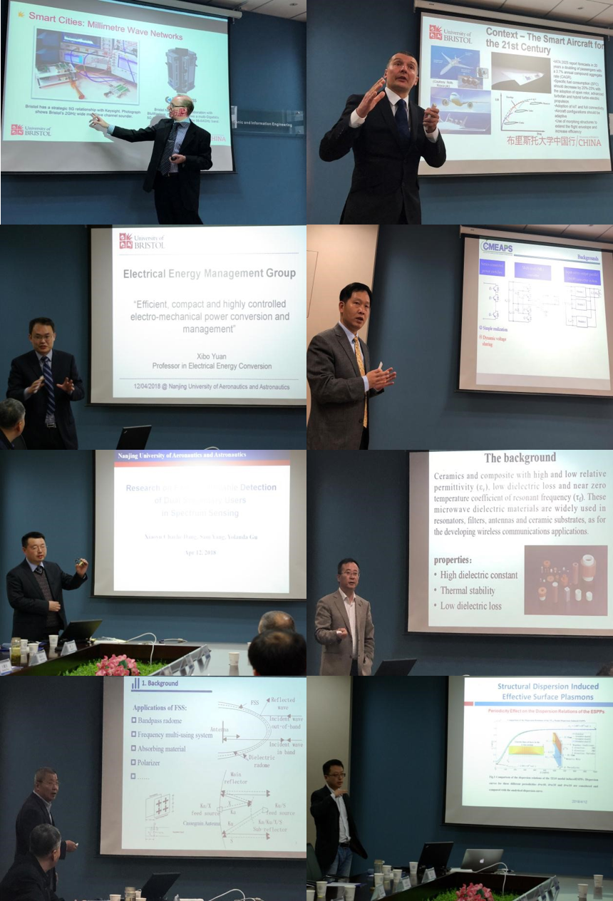 随后,研讨会以工学组和理学组为讨论单元,分别在209和211会议室同时进行。在工学组的讨论会上,Bristol大学Andrew Nix教授、Fabrizio Scarpa教授和Xibo Yuan教授分别就5G通信在智慧城市的应用、复合材料在微波电磁计算的应用以及电气能源管理技术等做了精彩的报告。与此同时,南航阮新波教授、党小宇教授、傅仁利教授、曹群生教授、李茁副教授也就上述研究方向介绍了自己课题组的研究成果,受到了英国教授们极大的兴趣与重视,双方互相交换名片和联系方式,表示要加强交流,增进日后学术合作。