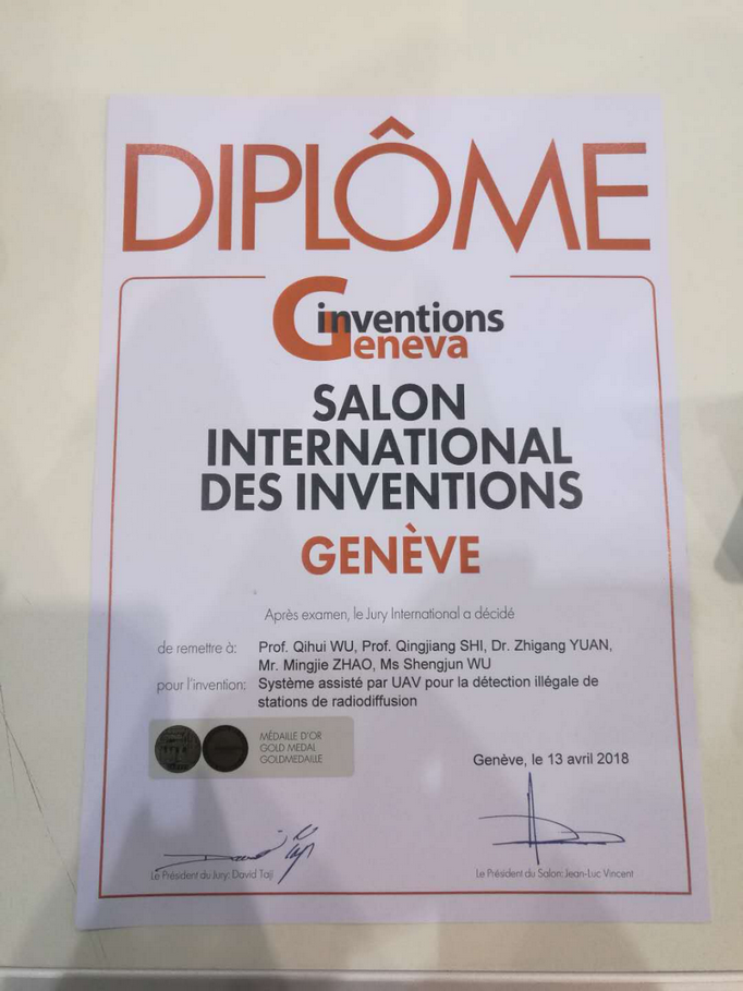 第46届日内瓦国际发明展于2018年4月11日至4月15日在瑞士日内瓦Palexpo会展中心举行,由我校Ebook漫画 参展的“UAV-Assisted System for Illegal Broadcasting Station Detection(基于无人机平台的非法广播电台搜索定位系统)”斩获金奖。该成果由长江学者吴启晖教授、史清江教授、袁志刚与黄洋副教授、戚楠讲师带领赵明杰、吴盛君、管鑫硕士、胡田钰本科生等人共同完成。