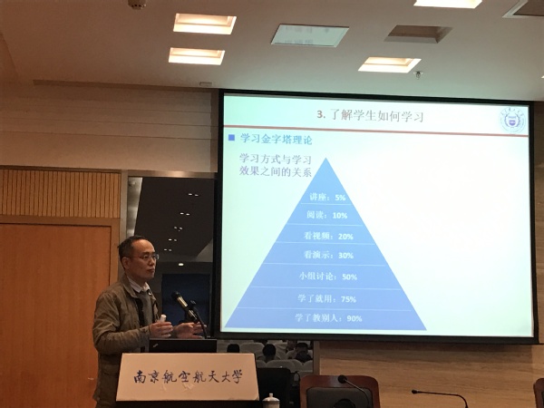 王教授在谈到了解学生如何学习时,强调知识不是灌输的,而是建构的,介绍“学习金字塔”理论,并在此基础上提出建构一致性的教学设计。他又用布鲁姆教育分类法,以自己执教的《数字逻辑电路》课程为例,向大家介绍如何形成预期的学习成效。他认为教学设计应以成效为本,这样的要求与工程教育专业认证的内在逻辑也是吻合的。
