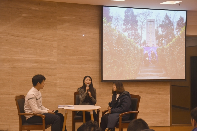 在沉郁严肃的氛围中,“致敬历史的见证者”实践团队作为此次活动的学生代表,和最近也积极投身相关主题实践活动的辅导员代表郭力榕,携手走到台前,为大家讲述他们在与南京大屠杀幸存老人深入交流当中,在搜寻遗落纪念碑时的收获与成长。他们以贴近实际的所见所闻,以满怀青春热血的讲述说明,悄然打动着现场的每个听众。