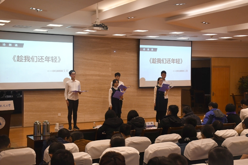 聆听实践团队的感悟分享之后,活动进入了“吟诵悲壮过往”环节。《北平,北平》吼出了为保华夏血脉延续,誓死反抗外来侵略的民族强音;《那些难忘的名字》追忆起在山河破碎、民生凋敝危机关头,力挽狂澜的民族脊梁;《英雄的黎明》勾勒出一代仁人志士前赴后继舍生取义换来的民族未来;《趁我们还年轻》凸显了重振山河,再造人间,时不我待只争朝夕的民族气概……