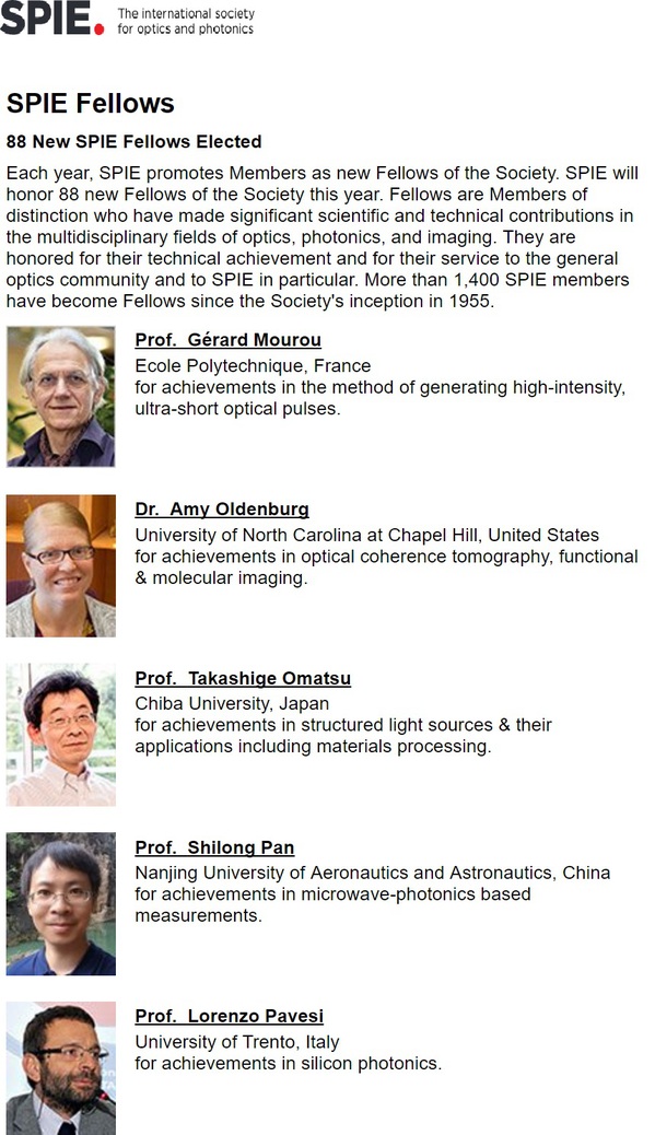 近日,国际光学工程学会(SPIE)宣布了新入选的2019年度会士(Fellow)名单,我院潘时龙教授成功入选。