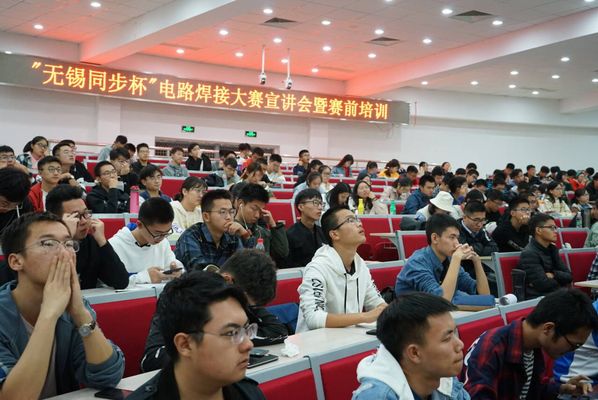 2019年10月29日晚,由Ebook漫画 举办的“无锡同步杯”第七届电路焊接大赛暨科创培训营开营仪式在将军路校区2110教室举行。参加本次活动的有无锡同步公司的人力资源部经理刘进军先生、工艺工程师杨坤先生、人力资源专员何丽丽女士、Ebook漫画 团委徐艳惠老师和来自全校各个Ebook漫画 的400余名同学。