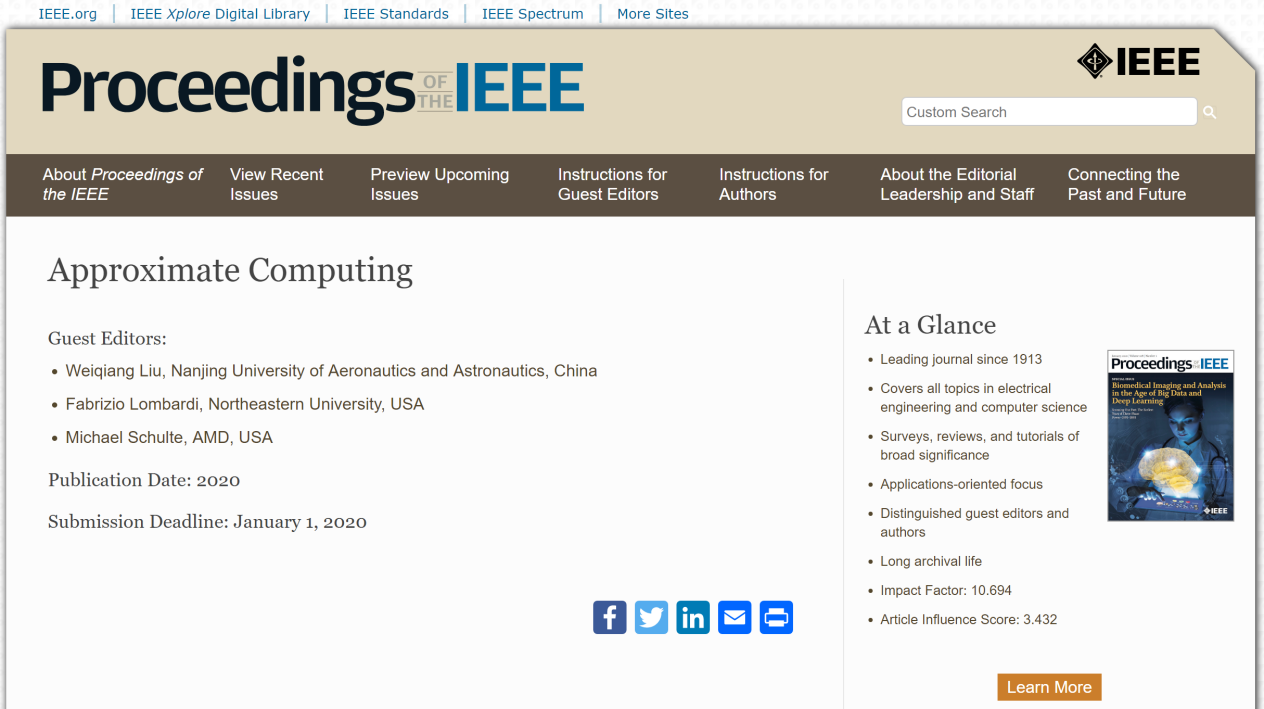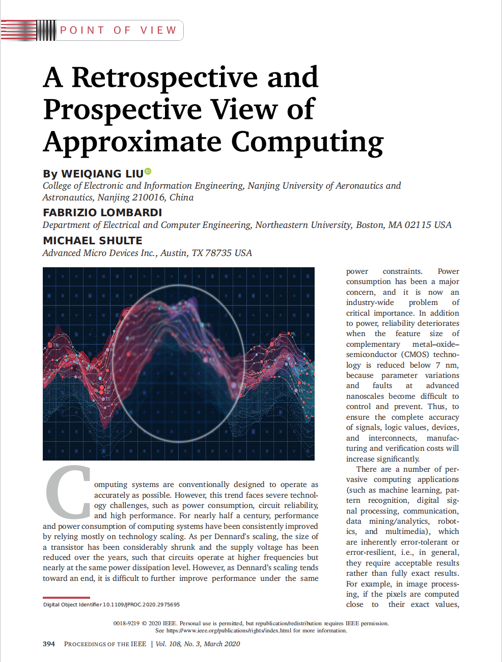 刘伟强副教授受邀与美国AMD公司的Michael Shuttle博士(AMD Senior Fellow)、美国东北大学的Fabrizio Lombardi教授(IEEE Fellow)在具有108年历史(创刊于1913年)的国际工程领域综合性顶级期刊《Proceedings of the IEEE》(影响因子:10.694)上组织了该期刊历史上首个关于近似计算器件、电路与系统的专辑“Approximate Computing”(图1)。并受邀发表了该期刊历史上首篇关于近似计算的观点性综述论文“A Retrospective and Prospective View of Approximate Computing”(图2)。这是我校也是南京地区高校首次在该期刊上组织专辑。