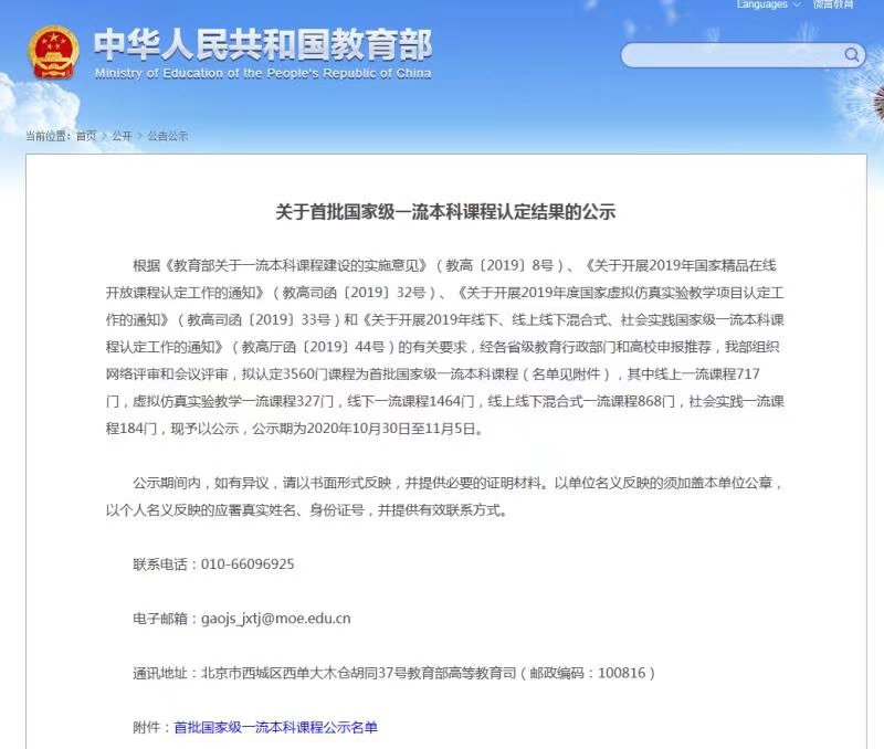 2019年10月,教育部正式发布关于一流本科课程建设的实施意见。目标经过三年左右时间,建成万门左右国家级和万门左右省级一流本科课程(“双万计划”)。国家一流本科课程认定经各省级教育行政部门和高校申报推荐,教育部组织网络评审和会议评审,拟认定3560门课程为首批国家级一流本科课程,其中线上一流课程717门,虚拟仿真实验教学一流课程327门,线下一流课程1464门,线上线下混合式一流课程868门,社会实践一流课程184门。