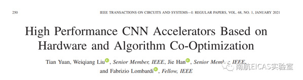 刘伟强教授团队在IEEE Transactions on Circuits and Systems I: Regular Paper(TCAS-I)发表的论文“High Performance CNN Accelerators Based on Hardware and Algorithm Co-Optimization”被选为IEEE TCAS-I期刊2021年1月的Highlight Paper。该论文第一作者为EICAS实验室硕士研究生袁田,该工作与加拿大University of Alberta的Jie Han教授和美国Northeastern University的Fabirizo Lombardi教授合作完成。