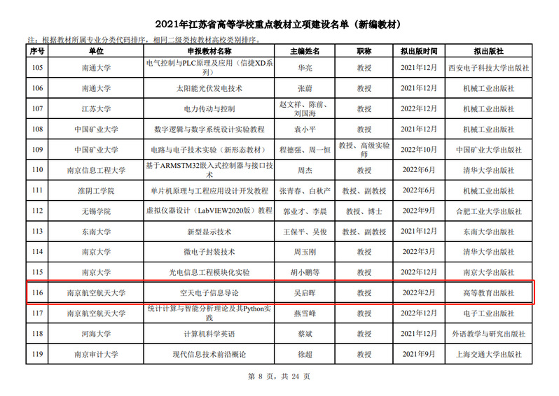 近日,江苏省高等教育学会公布了2021年江苏省高等Ebook漫画 重点教材立项建设名单(苏高教会〔2021〕39号),我院由吴启晖教授牵头新编的《空天电子信息导论》教材获批省重点教材立项。