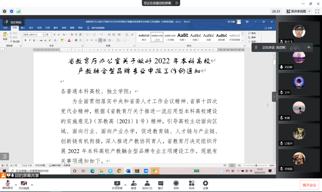 召开了“江苏省本科高校产教融合型品牌专业项目申报”线上研讨会。本次会议的主题是关于品牌专业项目申报书的修改及质量提升工作。受疫情影响,会议采用线上形式进行。