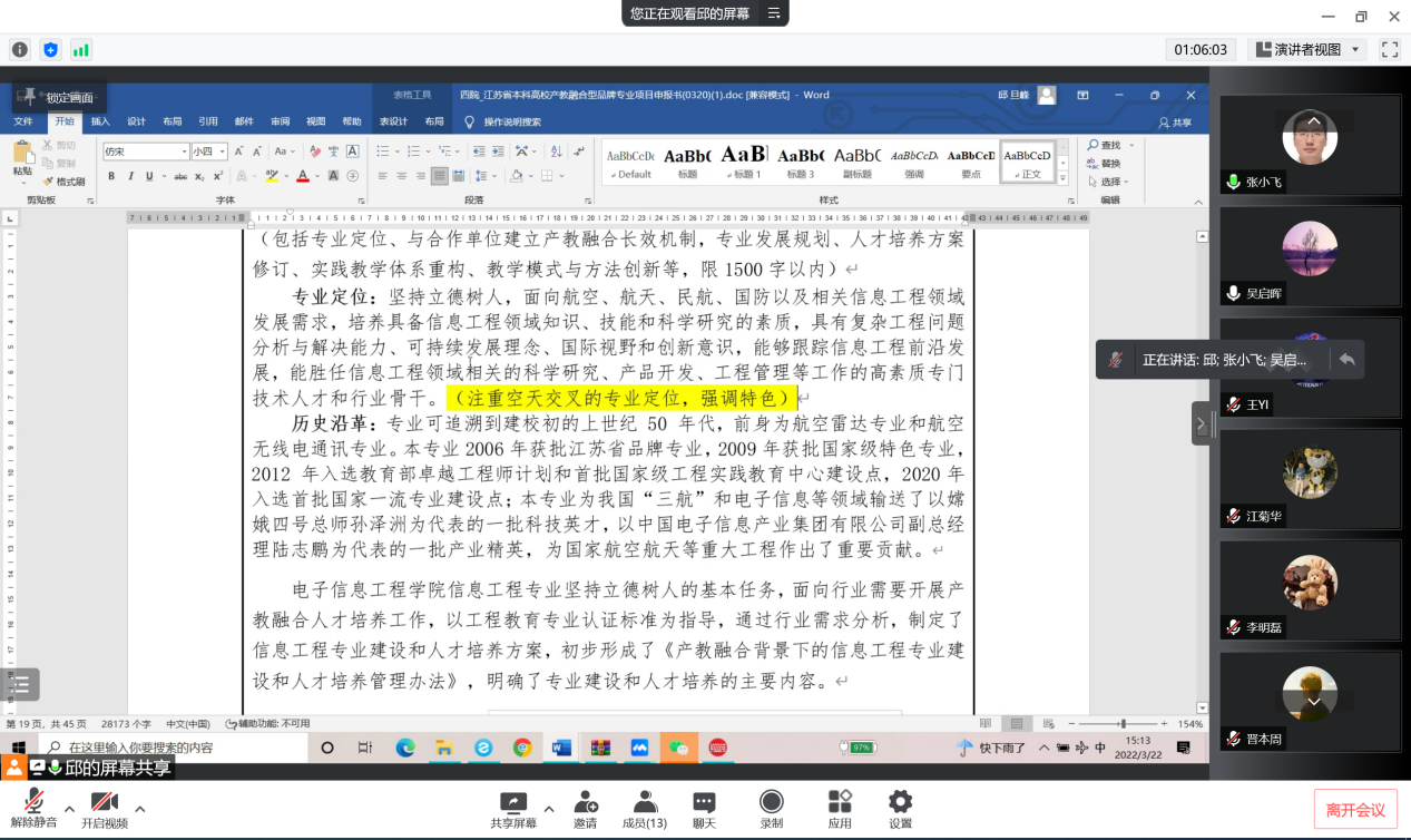 接下来,主持人邱旦峰老师及负责申报书各部分撰写的老师们针对已经形成的初稿进行详细的整体梳理,在此过程中,吴启晖教授针对各部分存在的问题以及可以提升的方面提出了多处建设性的指导建议,包括冗余内容的删减,必要素材的增加,以及特色方面的突出等;强调突出空天信息特色,形成产教融合的生态链的主线。