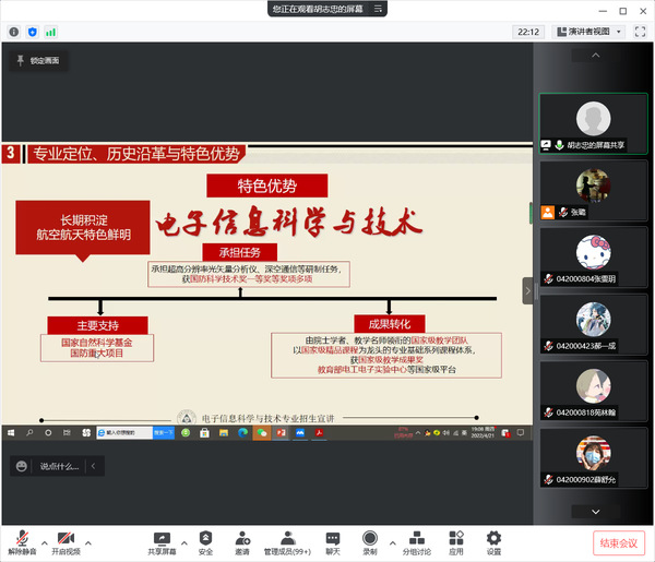 随后,电子信息科学与技术专业专业负责人胡志忠从专业定位、师资力量、就业前景等方面对电子信息科学与技术专业进行了详细介绍。胡志忠表示,电子信息科学与技术专业是以国家级教学名师为引领的具有航空航天特色的优势专业,本专业的学习内容及严格的科创实践能力训练为同学们成为电子信息科学与技术领域高级人才做了良好铺垫。