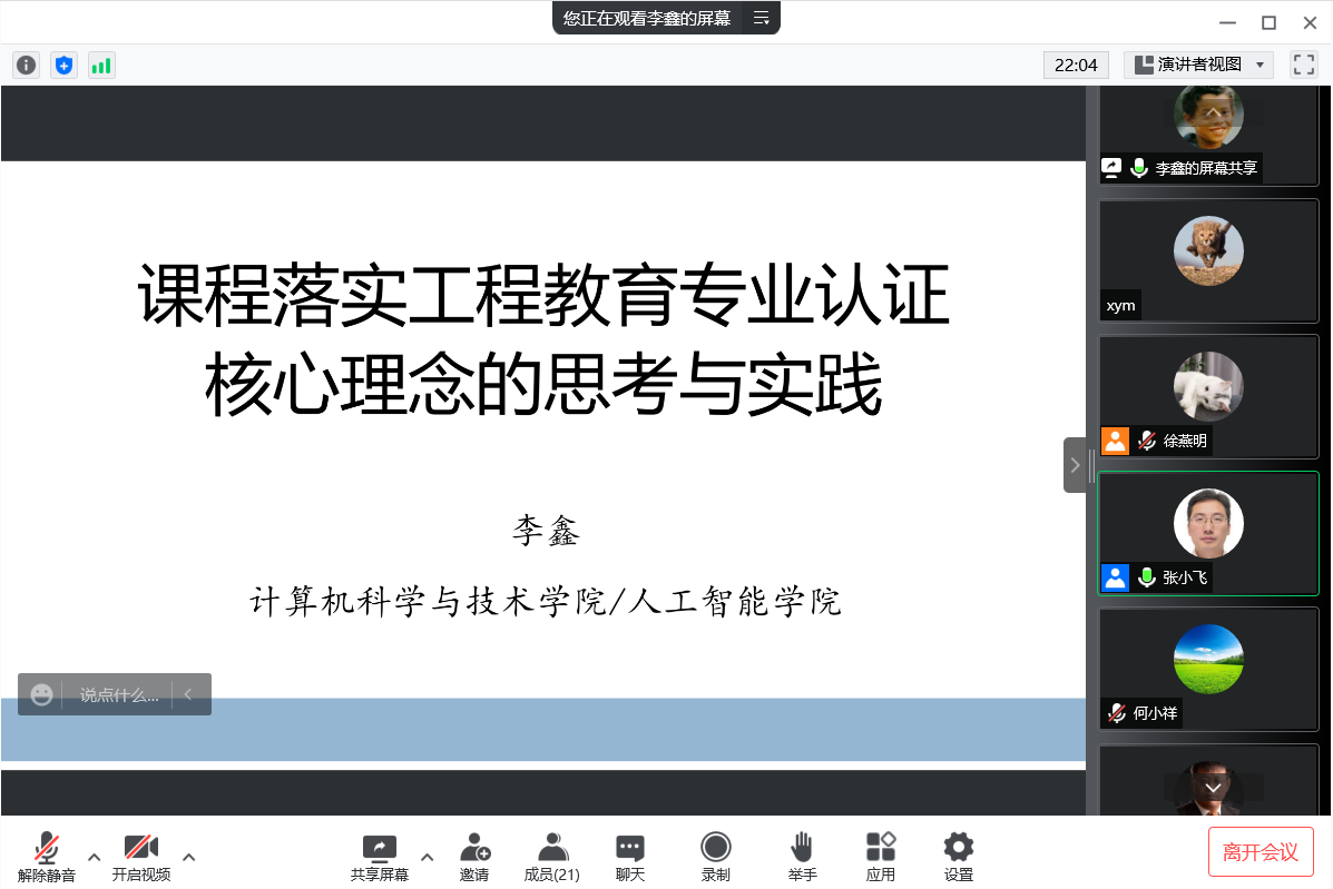 李鑫作了题为“课程落实工程教育专业认证核心理念的思考与实践”的报告,他从专业认证的基本内涵谈起,讲到专业认证核心理念是以学生为中心、产出导向教育、质量持续改进,当前的认证更关注专业在面向产出的标准制定、教学实施和质量评价方面是否有理有据、形成完整闭环。之后,他就课程如何落实专业认证核心理念,从课程目标、课程考核、课程教学与跟踪评价、课程目标达成情况评价等方面进行深入阐述。