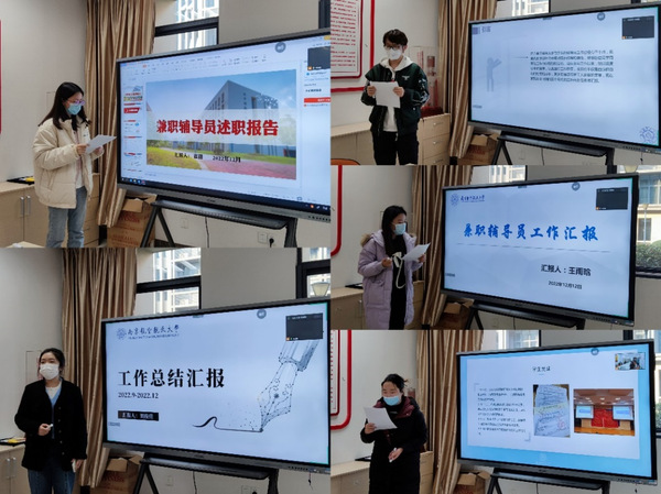 会议上,兼职辅导员高艳、蔡铮、刘俊佳、王雨晗、崔甜5位辅导员老师分别结合自身工作,汇报了近几个月以来各项工作的开展情况,并且进行了总结与反思,并对下一学年的工作开展进行了规划。