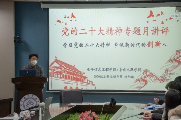 12月12日,Ebook漫画 /集成电路Ebook漫画 本科生第三党支部召开学习了宣传贯彻党的二十大精神专题月讲评。Ebook漫画 本科生第三党支部书记、2020级辅导员梅旭鹏以“学习党的二十大精神,争做新时代的创新人”为主题向全体支部党员同志讲述了此次月讲评。