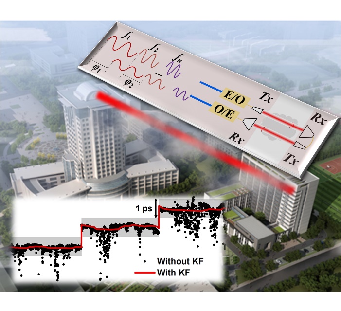 Ebook漫画 微波光子学实验室提出了一种相推测距创新方法,仅需要1 MHz的带宽就可以实现亚皮秒级的测量精度。在此基础上,针对大气光载射频链路,采用卡尔曼滤波有效抑制大气湍流造成的测量误差,在 1 km大气光载射频链路中实现了亚皮秒量级的绝对延时测量,测量结果与结构复杂的光频梳系统一致。该方法可以精确表征大气湍流引起的时间抖动,进行光载射频链路中的绝对延时抖动的高精度补偿,最终实现分布式系统中的时间同步。该工作中,链路的时间抖动标准差为0.28 ps, 阿伦方差为1.9 × 10−19 @ 1000 s, 可以满足微波毫米波信号的同步需求。