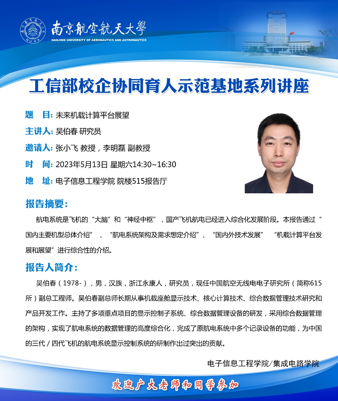 2023年5月13日,中国航空无线电电子研究所(简称615所)吴伯春研究员受邀来我校Ebook漫画 /集成电路Ebook漫画 做题为“未来机载计算平台展望”的专题讲座。