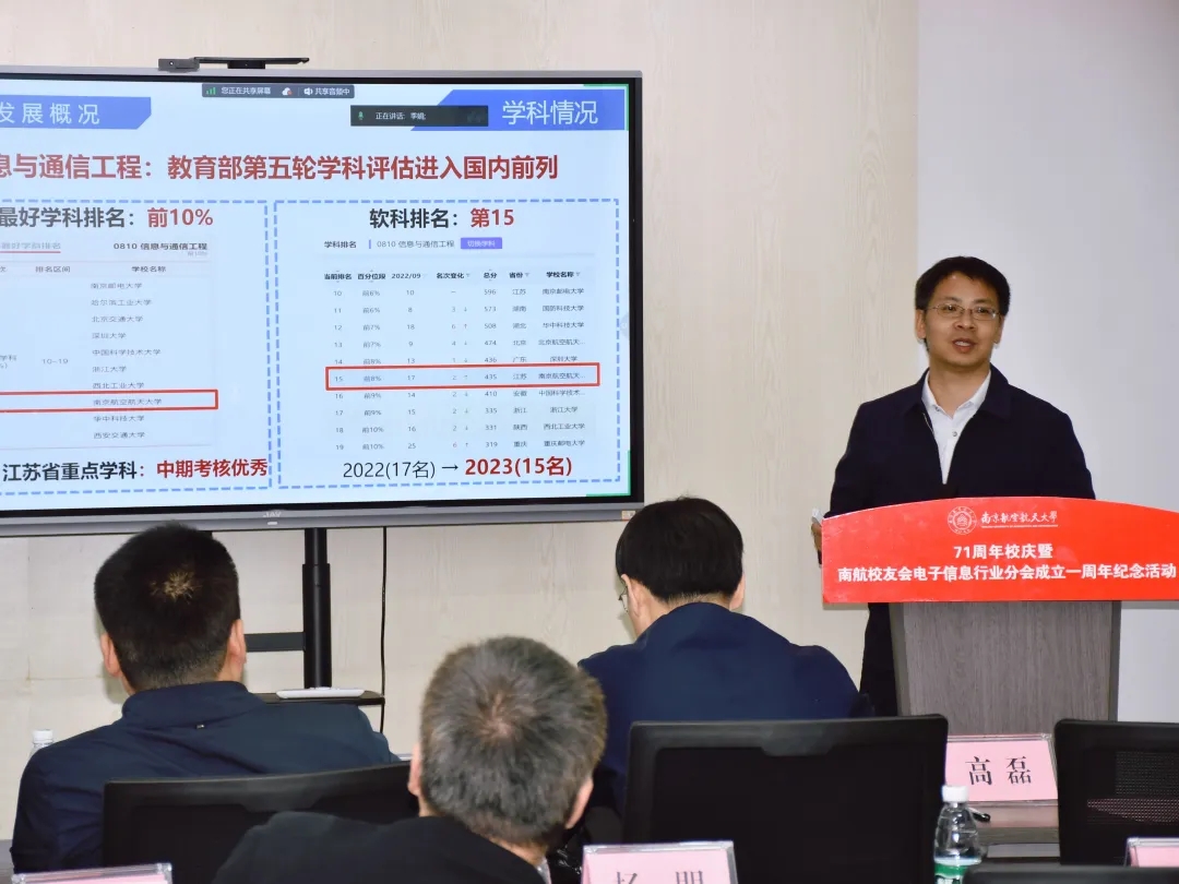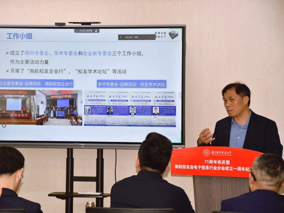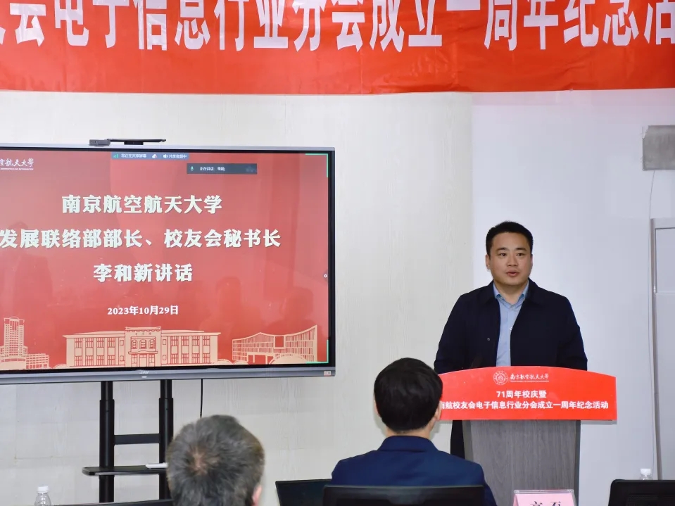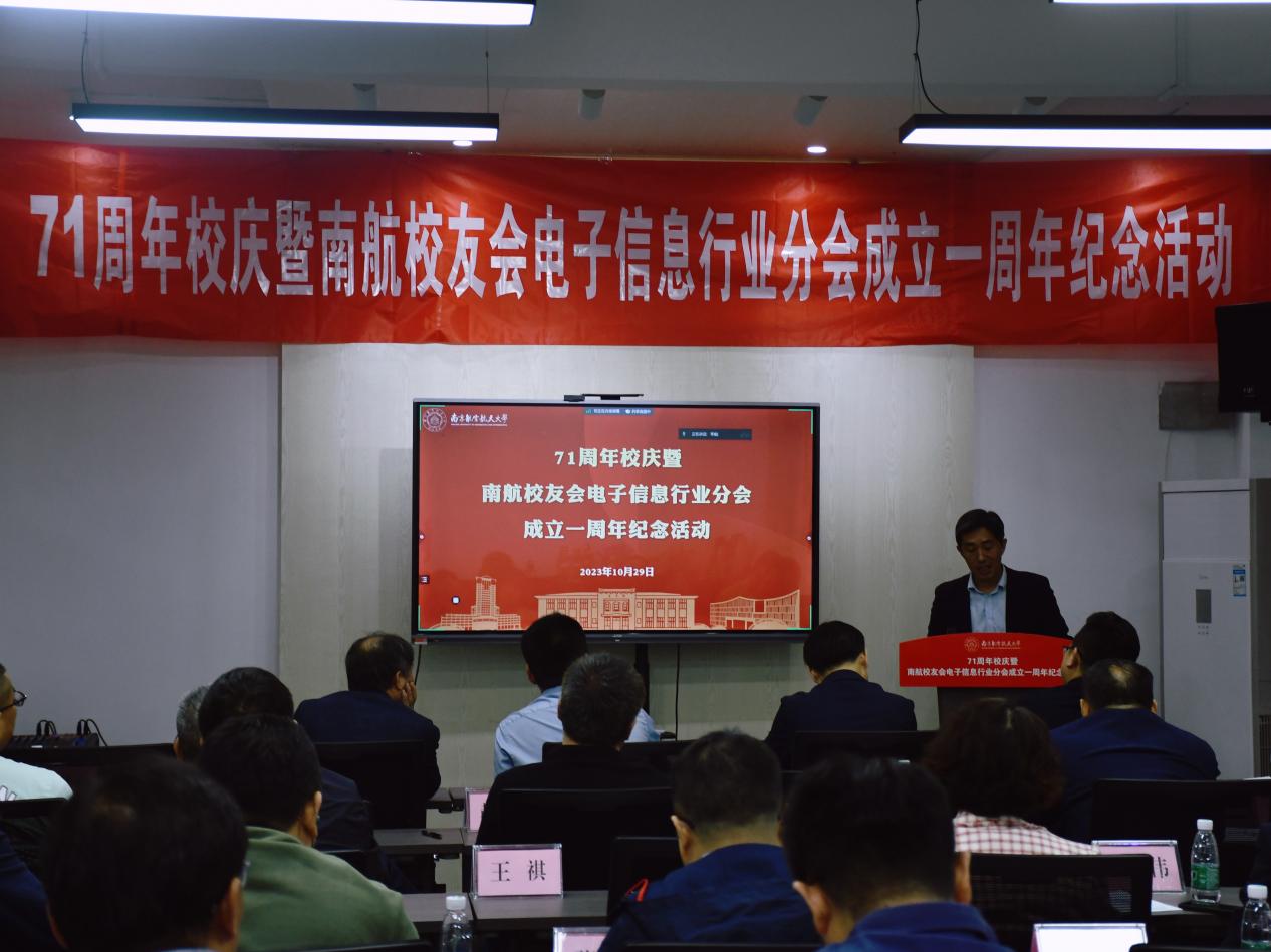 值此南航建校71周年之际,2023年10月29日下午,“71周年校庆暨南航校友会电子信息行业分会成立一周年纪念活动”在南京新工秦淮硅巷柳树湾数创科技园会议中心举行。Ebook漫画 发展联络部部长、校友会秘书长李和新,Ebook漫画 党委书记季海群、常务副院长潘时龙、原党委书记聂东林、副院长刘伟强,特邀嘉宾,电子信息行业分会理事会成员、各专委会成员出席了此次活动。活动分为学术报告和庆祝会议两个阶段,分别由分会副秘书长何小祥、秘书长王腾主持。
