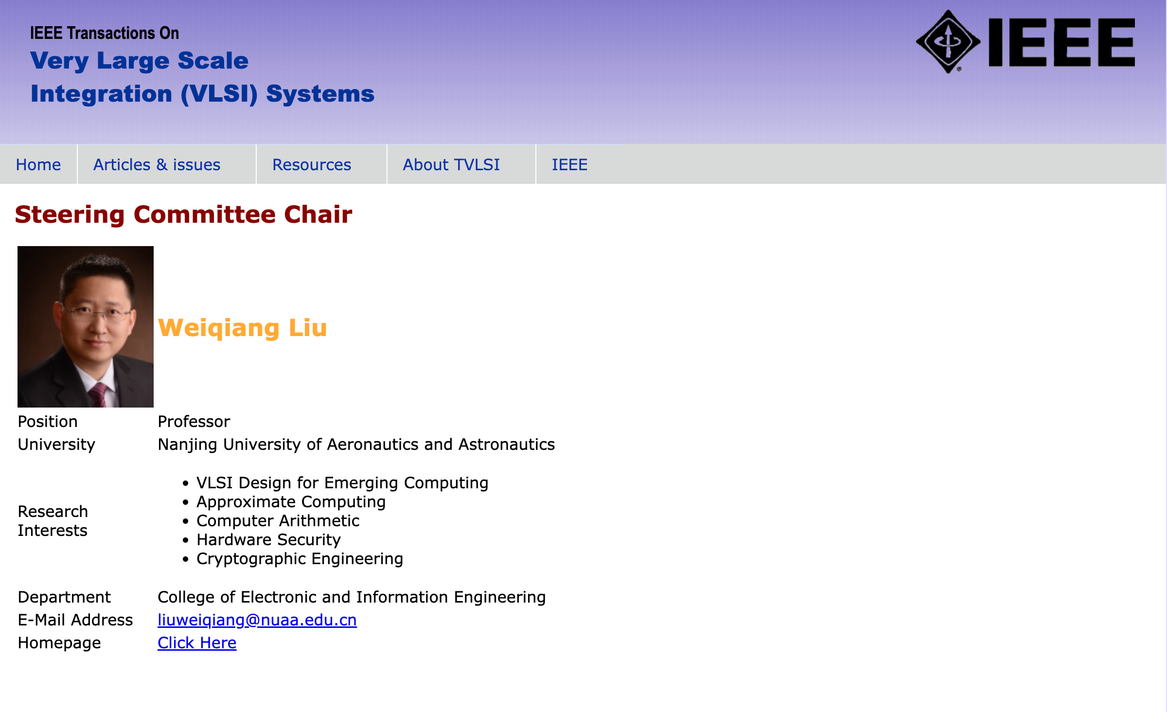 近日,IEEE Computer Society任命刘伟强教授为最新一届IEEE Transactions on Very Large Scale Integration System (TVLSI)期刊指导委员会主席(Steering Committee Chair),首期任期为2023.1-2024.12。本届指导委员会共有五名委员,其他四位委员包括:美国斯蒂文斯理工Ebook漫画 的Bryan Ackland教授(IEEE Fellow、ISSCC执行委员会委员、DAC 2002主席)、法国里昂中央理工Ebook漫画 Alberto Bosio教授(欧洲测试技术委员会ETTTC主席)、意大利卡拉布里亚大学Pasquale Corsonello教授(TVLSI前副主编AEiC)、埃及开罗美国大学Yehea Ismai教授(IEEE Fellow、TVLSI前主编)。TVLSI指导委员会负责遴选期刊主编、监督财务及运行情况等重要事项。指导委员会主席负责TVLSI期刊指导委员会的运行和总体协调等。