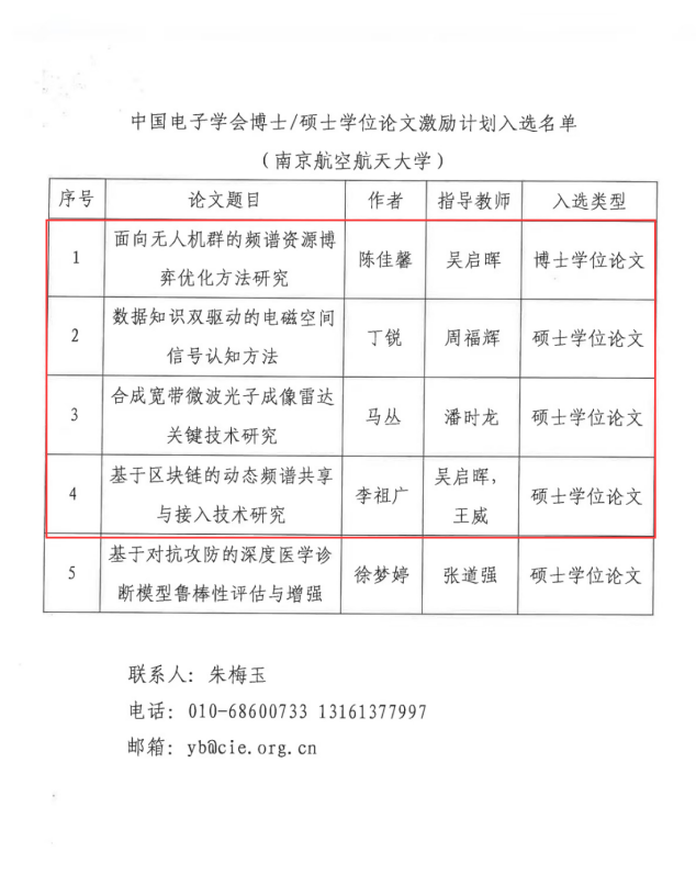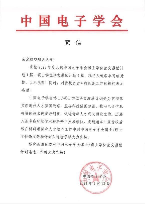在本次遴选结果中,我校共有5篇学位论文入选激励计划,其中我院占4篇:博士学位论文激励计划1篇,硕士学位论文激励计划3篇。中国电子学会也给我校发来了贺信,感谢我校对此次学位论文激励计划遴选工作的大力支持!