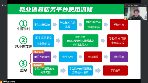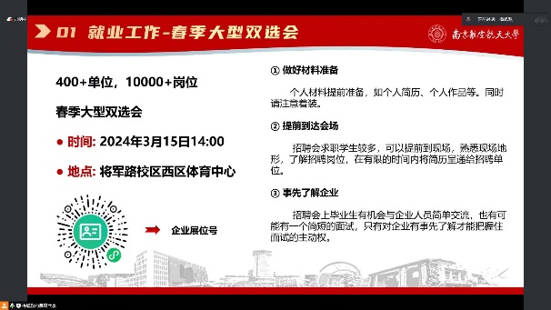 梅旭鹏为同学们梳理了签约就业的基本流程,详细讲解了南航就业信息服务平台与智慧就业系统的具体使用方法,并鼓励同学们参与校区举办的春季系列双选会,了解当前的就业环境,做好面试的前期准备工作。