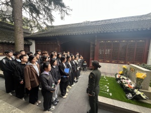 在新四军江南指挥部纪念馆,在讲解员的带领下,同学们参观了指挥部旧址,通过英雄遗物和文献资料,了解了抗日战争中先辈们血与火的革命生活,体悟了前辈们的顽强意志和伟大精神。将军墓前,同学们列队肃立默哀,向粟裕将军致以最崇高的敬意和最深切的哀思。