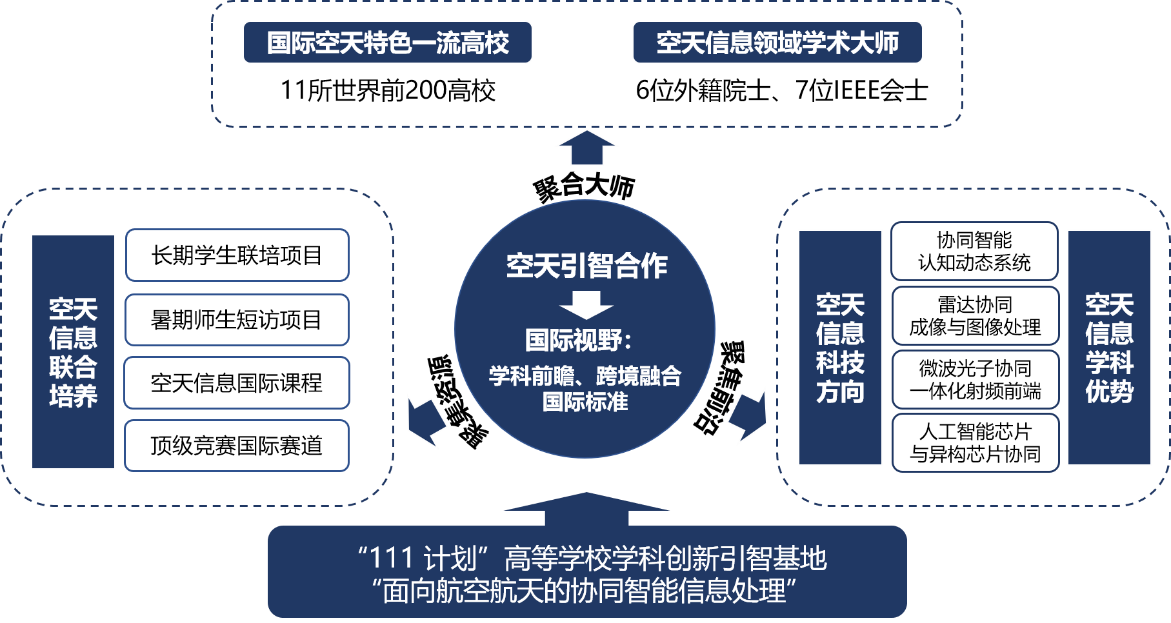 基于空天引智合作,打造学生-学术-学科互促生态,拓展国际前沿视野。以111引智基地为依托,面向协同智能认知动态系统、雷达协同成像与图像处理、微波光子协同一体化射频前端、人工智能芯片与异构芯片协同等4个前沿科技方向,联合英、德、加等15国学术大师建设中外合作团队,开展本、硕、博贯通的多样化国际联合培养,包括校际联合培养项目、学生出国短访、毕业生联合培养、暑期国际课程等,进一步提升学生对空天信息时代国际形势和学术前沿的把握。