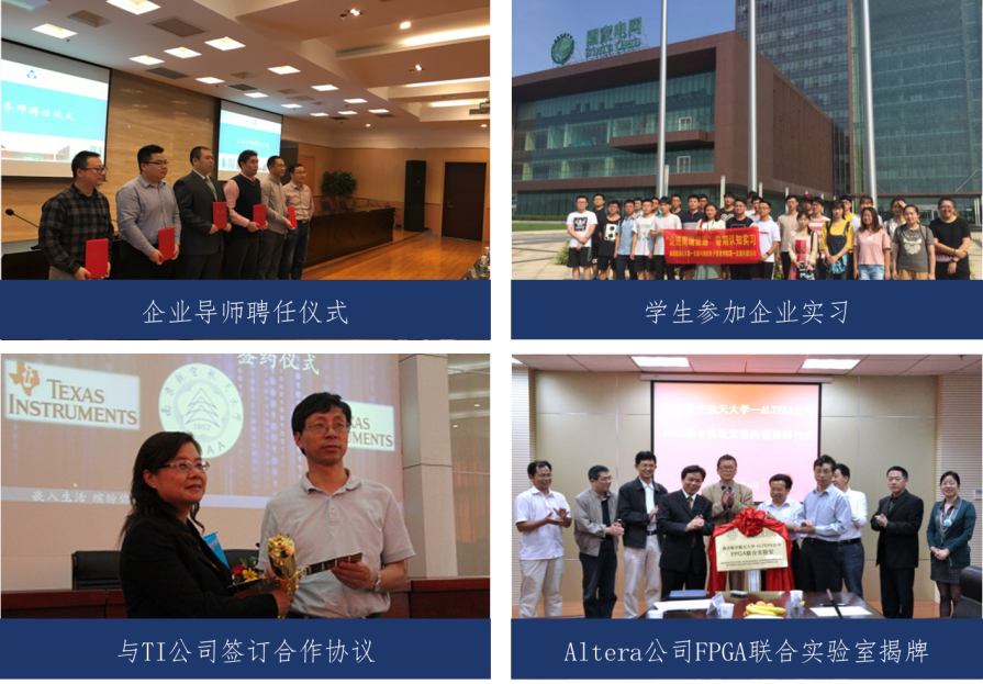 联合中国航空无线电电子研究所(六一五所)、南京长江电子信息产业集团有限公司(七二〇厂)、中兴通讯股份有限公司(中兴通讯)、中国航天科工集团八五一一研究所(八五一一所)、中国电子科技集团公司第五十八研究所(五十八所)、中国航空工业集团公司洛阳电光设备研究所(六一三所)等国家大型企事业单位,建立了国家级工程实践教育中心、工信部校企协同育人基地等校企共建实习实训基地22个。人才培养全过程、各环节均有相应的强力合作企事业单位协作支撑,重点培养学生技术攻关和系统集成能力。
