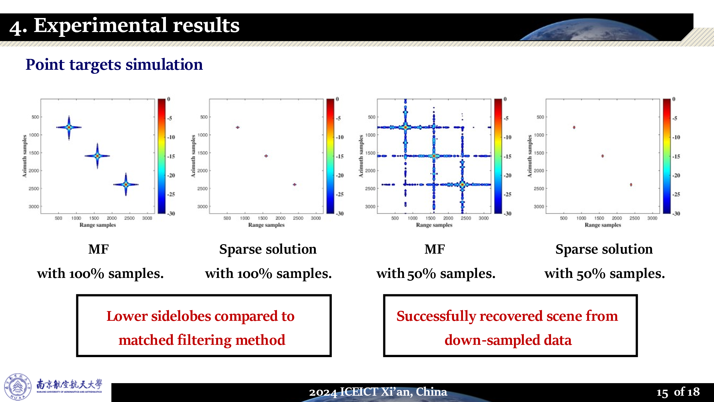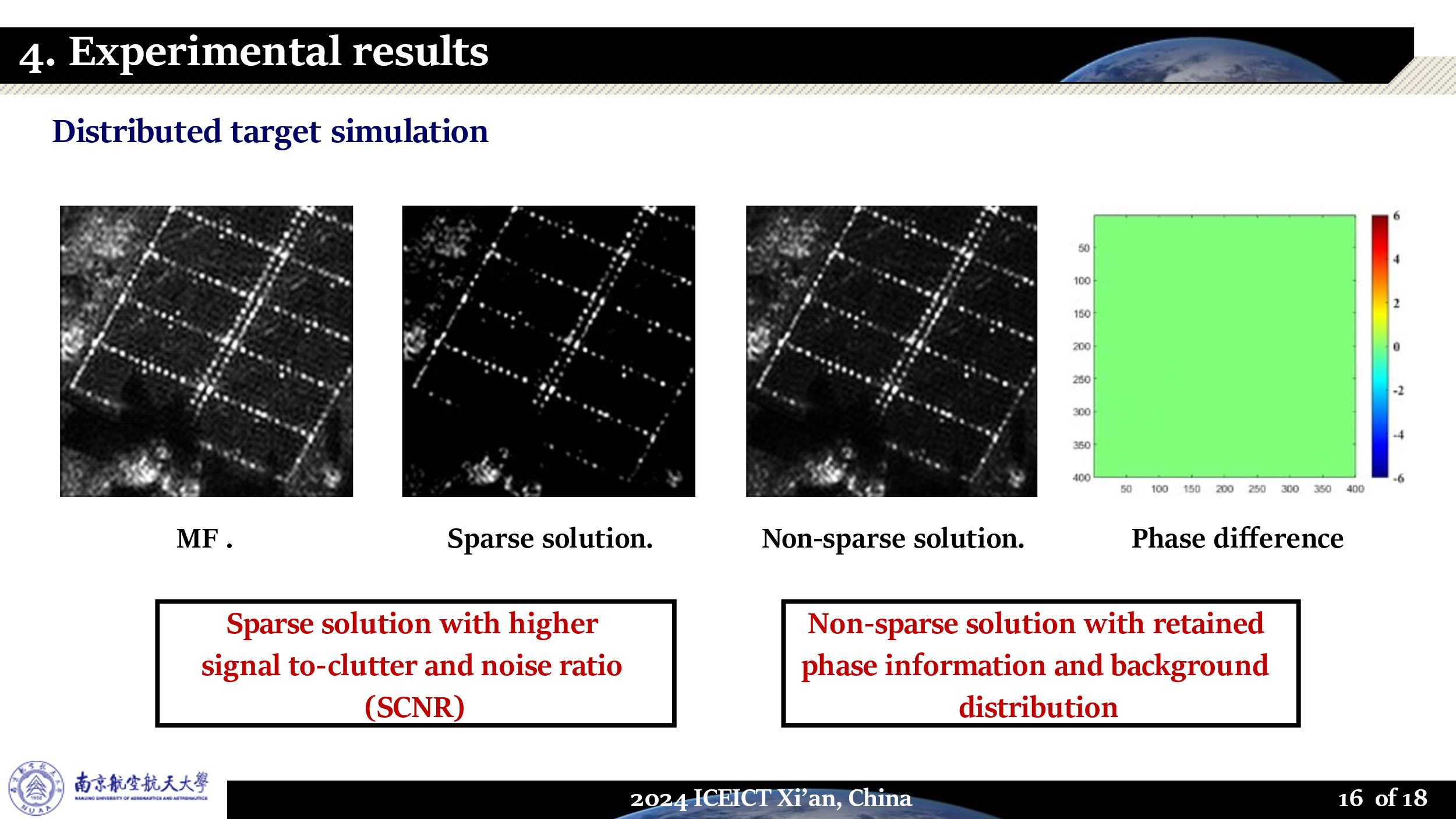 此次获奖论文题目为《Exact Observation Based Phase Preservation Bistatic SAR Sparse Imaging: Initial Result》(基于精确观测的相位保持双站SAR稀疏成像:初步结果),该文提出了一种全新的双站SAR稀疏成像方法,与匹配滤波方法相比,所提方法可以抑制目标旁瓣和杂波,从而提升图像信杂比。此外,相比于传统稀疏SAR成像方法,该方法有效地保留了相位信息和背景统计特性。