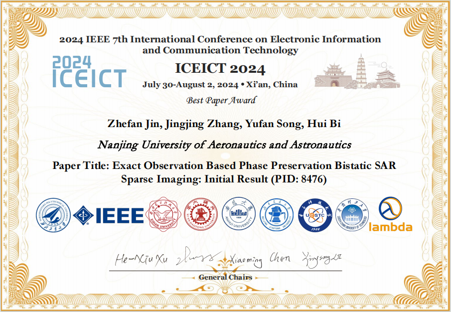 2024年7月30日至8月2日,2024 IEEE 7th International Conference on Electronic Information and Communication Technology(ICEICT 2024)在西安开幕。毕辉教授课题组研究生金哲凡的论文《Exact Observation Based Phase Preservation Bistatic SAR Sparse Imaging: Initial Result》获得ICEICT 2024最佳论文奖。