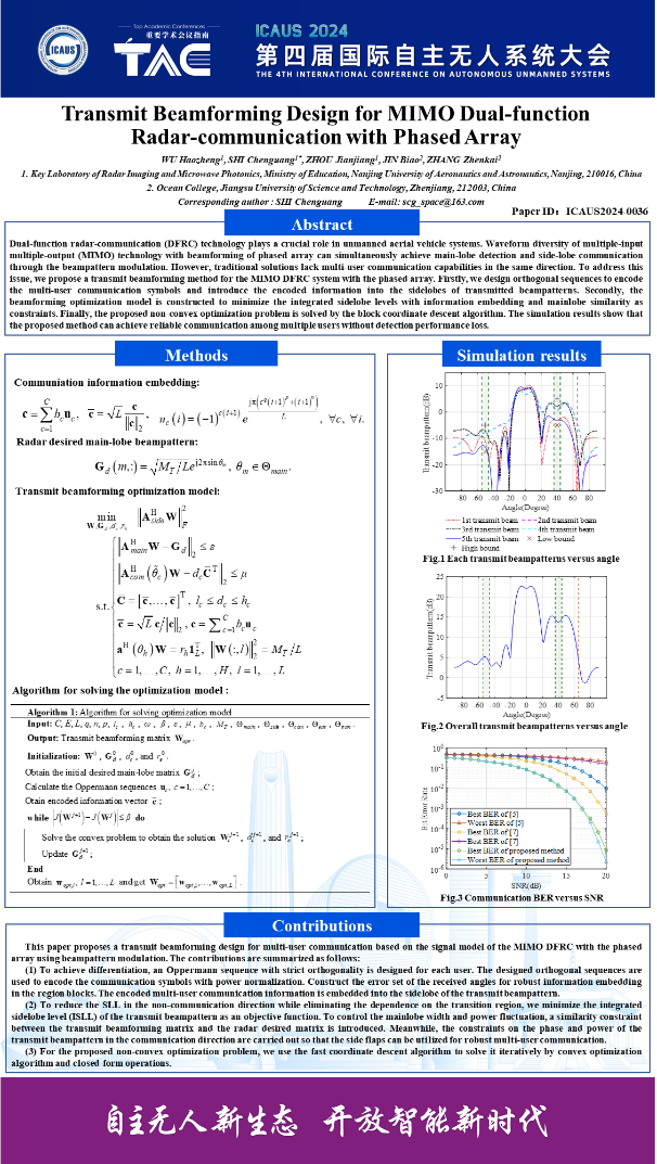 2024年9月19日至9月21日,国际会议The 4th International Conference on Autonomous Unmanned Systems (ICAUS 2024)在沈阳开幕。我院周建江教授课题组博士生武浩正的论文《Transmit Beamforming Design for MIMO Dual-function Radar-communication with Phased Array》获得ICAUS 2024最佳海报奖。本届会议共收稿583篇,其中,20篇论文获得最佳海报奖,占论文总数的3.4%。