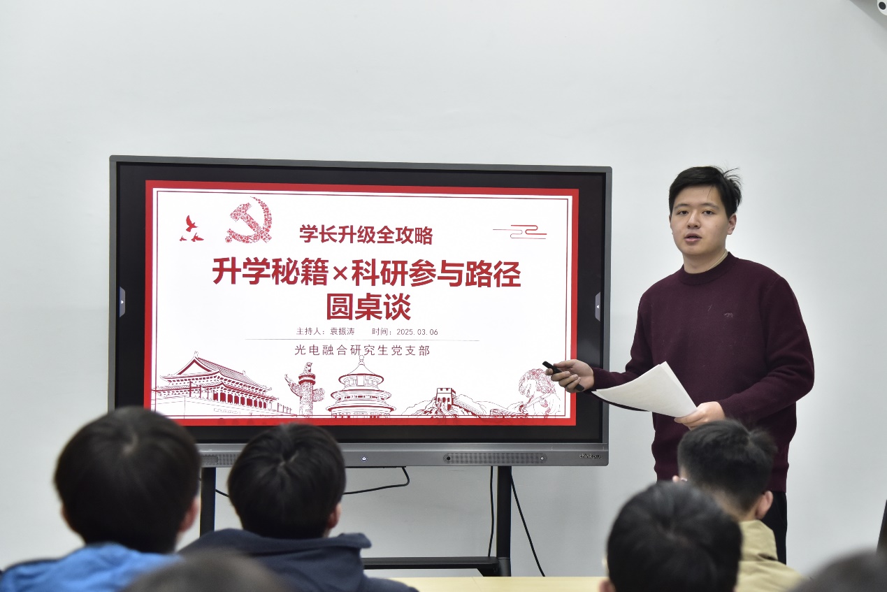 党支部书记袁振涛从党支部建设基本情况、团队老师、学术成果及学生培养等方面全面介绍了微波光子技术国家级重点实验室。针对大三学子即将面临的升学问题,他结合自身经历,从各科备考策略到最佳复习时间规划,分享了细致全面的考研备考建议。他提到,考研是一场“持久战”,一旦明确了目标就要立刻开始行动,并持之以恒地付诸努力。