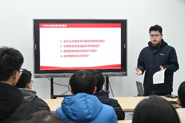 针对本科生关心的“科研入门难”问题,研究生党支部成员郑哲楷分享了他在本科期间“从无到有”的科研经历,深刻阐释了科研学习中理论与实践的关系。赵晓卓从接触科研可能遇到的问题出发,分享了他的科研初心和成长路径,鼓励低年级学生从兴趣出发,积极参与科研,勇于试错探索。