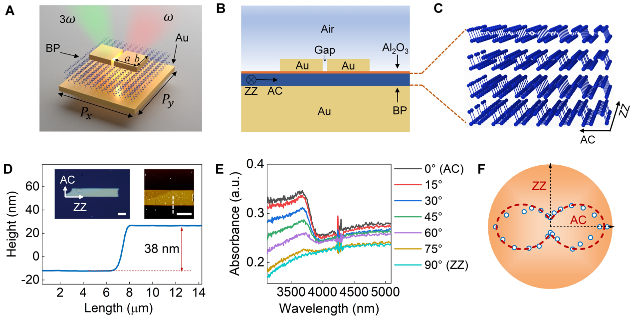 黑磷的登场改变了这一局面。这种层状范德华材料具有独特的可调带隙:从单层的1.8 eV(可见光)到块体的0.34 eV(中红外),完美覆盖中红外光子能量需求。理论预测表明,其强各向异性晶体结构(扶手椅方向AC与锯齿方向ZZ)可能激发超高非线性响应,但如何将这一潜力转化为实际性能,仍是悬而未决的难题。