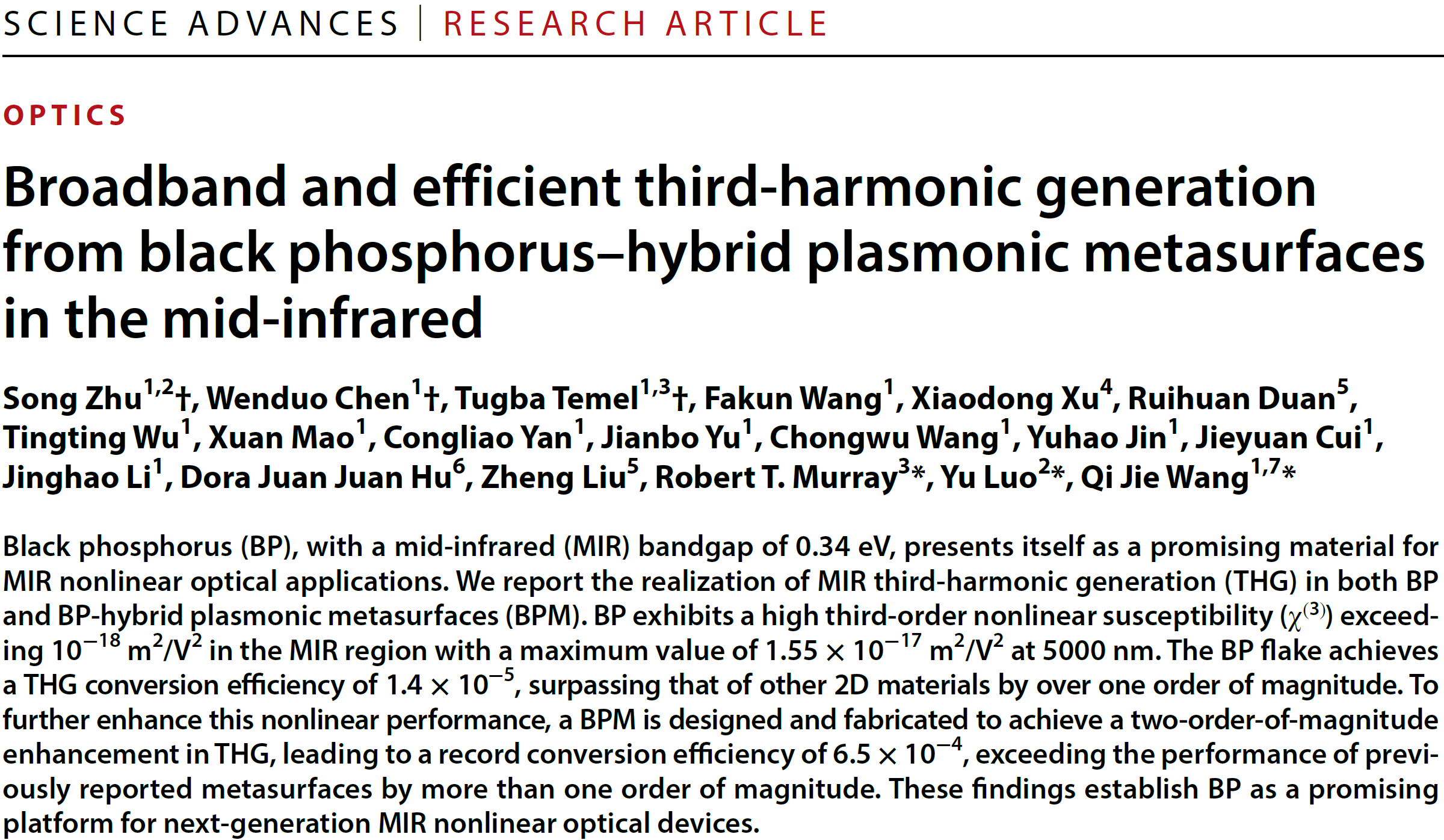 近日,我校Ebook漫画 罗宇教授团队联合新加坡南洋理工大学王岐捷教授和伦敦帝国理工Ebook漫画 Robert T. Murray教授在国际顶刊《Science Advances》上发表了一项突破性研究成果,成功利用黑磷(Black Phosphorus, BP)及其混合等离子体超表面(BPM),在中红外波段实现了宽带高效的三次谐波生成(Third-Harmonic Generation, THG),其转换效率创下历史新高。这一突破不仅填补了中红外非线性光学材料的性能空白,更为下一代超快光子器件、频率转换技术及集成光子学开辟了全新路径。王岐捷教授、罗宇教授和Robert T. Murray教授为该论文的通讯作者;我校朱松教授为论文的第一作者。