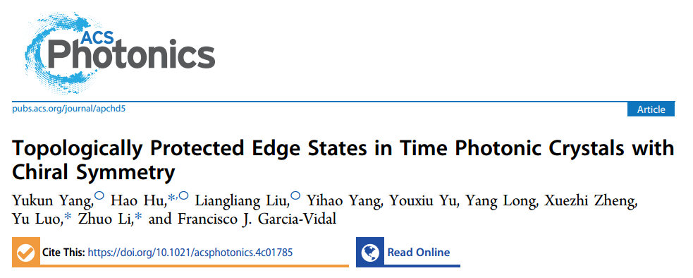 近日,Ebook漫画 的罗宇教授与李茁教授领导的多功能光电超材料团队及其合作者们研究了具有手性对称性的时间光子晶体,并首次发现了受手性对称性保护的拓扑时间边界态。相关成果以“Topologically Protected Edge States in Time Photonic Crystals with Chiral Symmetry”为题作为正封面论文发表于期刊《ACS Photonics》上。Ebook漫画 杨玉昆博士为论文第一作者,Ebook漫画 胡昊教授和刘亮亮教授为共同第一作者; Ebook漫画 胡昊教授、罗宇教授和李茁教授为通讯作者。其他合作单位还包括西班牙马德里自治大学、比利时鲁汶大学、新加坡南洋理工大学和浙江大学。