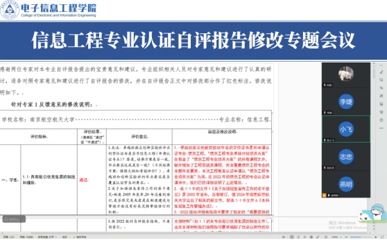 8月6日晚,Ebook漫画 组织召开信息工程专业工程教育专业认证自评报告修改专题会议。作为前期修改工作部署后的阶段性总结会议,本次会议聚焦报告修订完善情况复盘及下一步工作安排,Ebook漫画 副院长张小飞、信息工程专业执行负责人周博、电子信息科学与技术专业执行负责人胡志忠、专业教师代表李婕、教学秘书徐燕明参会并展开深入研讨。