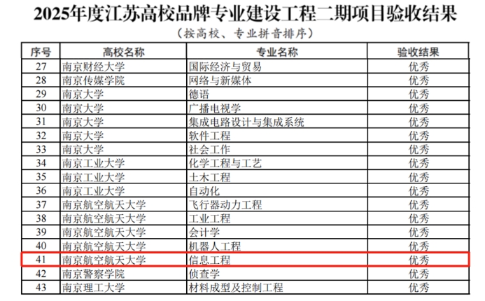 近日,江苏省教育厅发布了《2025年度江苏高校品牌专业建设工程二期项目验收结果公示》,我院信息工程专业凭借扎实的建设成效、突出的专业实力,在此次验收中荣获“优秀”等次。据悉,我校共有5个专业在本次验收中斩获“优秀”。